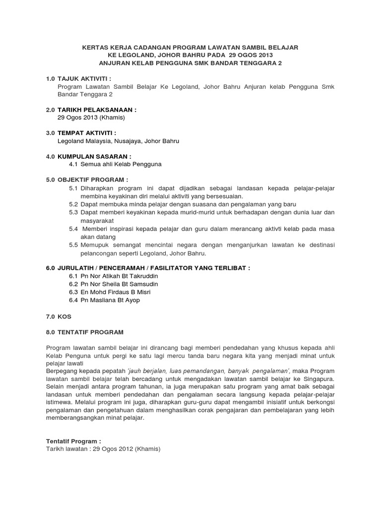 KERTAS KERJA LAWATAN SAMBIL BELAJAR KE PULAU PINANG TARIKH DAN HARI. Garis panduan pelaksanaan karakter murid johor krmj dan penyelarasan teks doa perhimpunan mingguan sekolah negeri johor tahun 2017. Apabila persetujuan dicapai kertas kerja disiapkan untuk ditandangani oleh ketua jabatan Guru Besar.